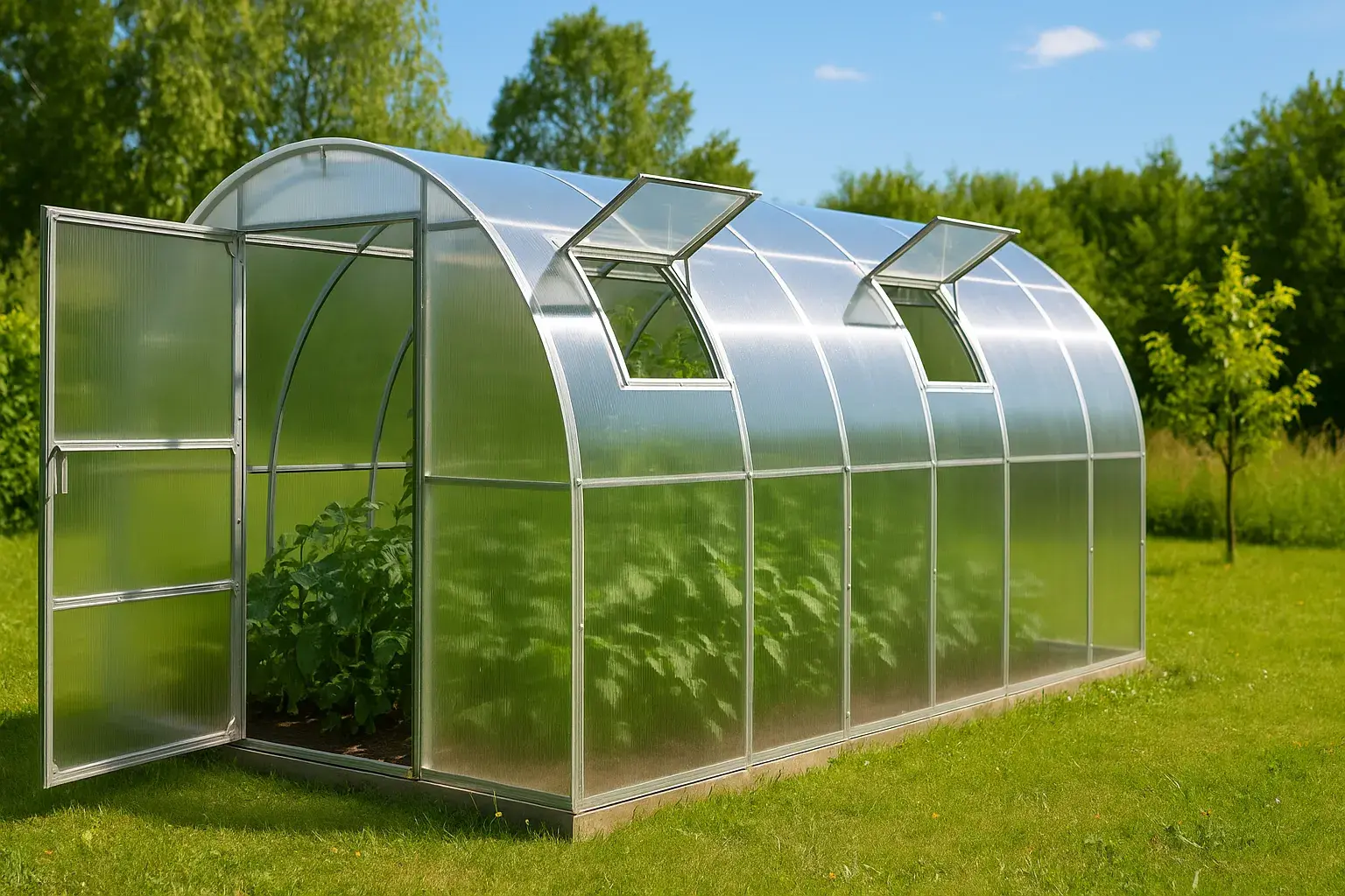 Вентиляция в теплице – залог здорового урожая. Форточки позволяют регулировать температуру и влажность без существенных потерь тепла. Во всех наших теплицах предусмотрены две двери и две форточки. Такая конструкция обеспечивает приток свежего воздуха, защищая растения от перегрева и избыточного CO₂.