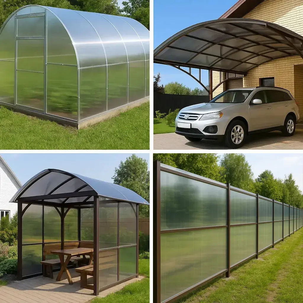 Поликарбонат — современный и востребованный материал, сочетающий высокую прочность, лёгкий вес и устойчивость к погодным условиям. Его применяют на дачных и приусадебных участках: от теплиц и навесов до остекления и заборов.